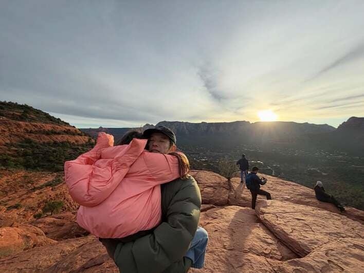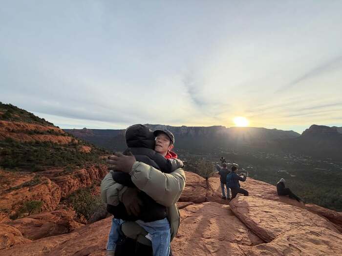 年末年始を過ごしたアメリカのセドナで地平線から昇る朝日をバックに子供たちとハグする姿を公開しました。