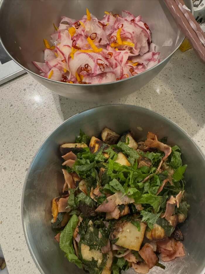 キッチンの作業台に置かれた二つの金属ボウルには料理の準備段階の食材が並び、薄くスライスされ花弁のように美しい赤大根など豊かな彩りが料理への期待感を高めます。