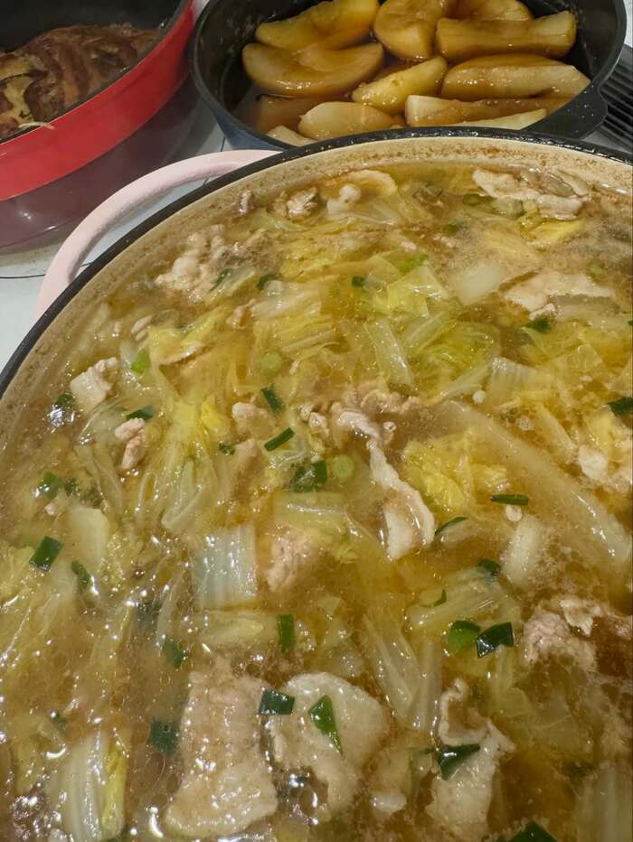 写真には、キッチンの大きな鍋で白菜と豚バラ肉を煮込む様子が写っており、スープがなみなみと入った鍋が印象的です。鍋の奥には、黄金色に煮込まれた大根の姿も見えています。