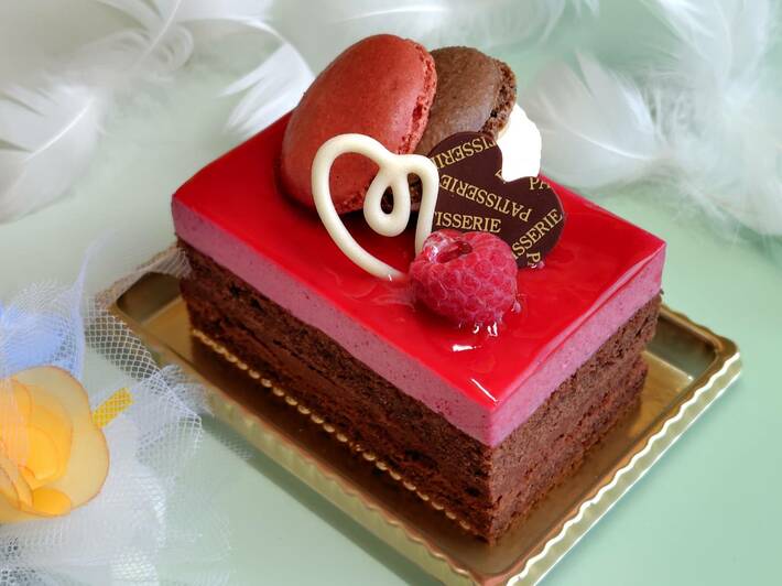「ルージュ・ショコラ」は、甘酸っぱいフランボワーズムースと、濃厚なクーベルチュールガナッシュを重ねた華やかな一品。情熱のルージュカラーをショコラブラウンが大人っぽく引き締める、バレンタインシーズンにぴったりのスイーツです。