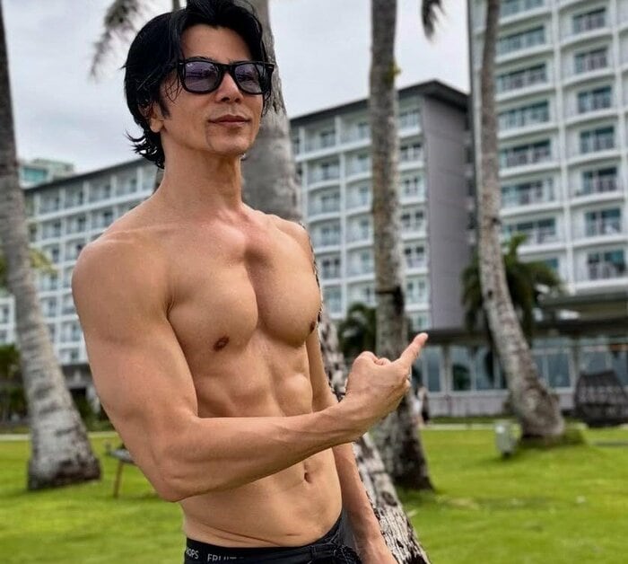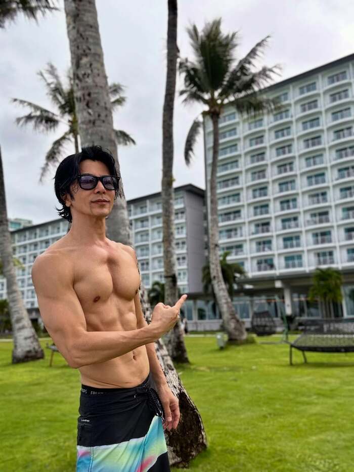 サングラスをかけた水着姿で、鍛え上げられた上半身を披露しています。