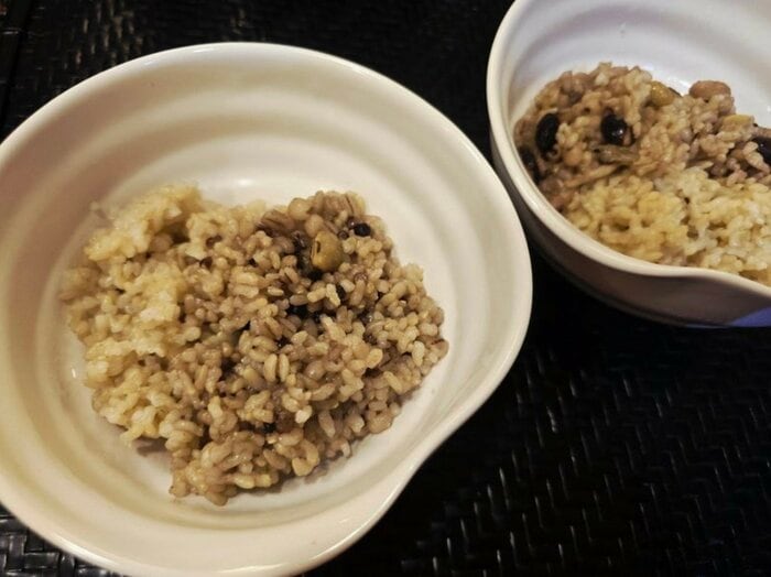 さらに「ごはんは玄米豆ごはんと玄米だけごはんを半分ずつ」とのことで、健康へのこだわりも感じられます。
