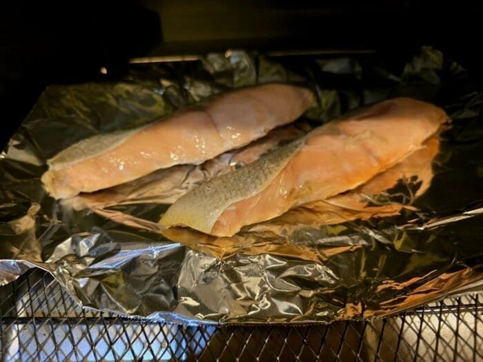 オーブンの中で焼かれている鮭は、こんがりとした焼き色がつき始めており、香ばしい香りが漂ってきそうですね。