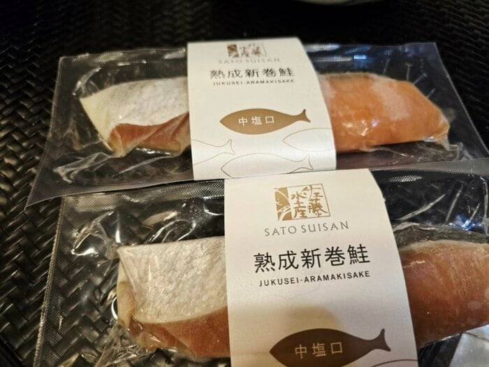 写真には透明なパックに入った「熟成新巻鮭」が写っており、ラベルには「中塩口」の文字も見え、いかにもご飯が進みそう…。脂がのったオレンジがかったピンク色の身がとても美味しそうです。