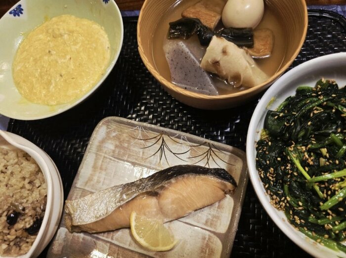 高橋さんはブログで「今夜はおうち晩ごはん」と切り出し、食卓に並んだ豪華な和定食の写真を公開。黒い編み目の敷物の上には、焼き鮭、おでん、ほうれん草のおひたしなどが並び、鮭の照りや野菜の緑が映え食欲をそそる一枚です。