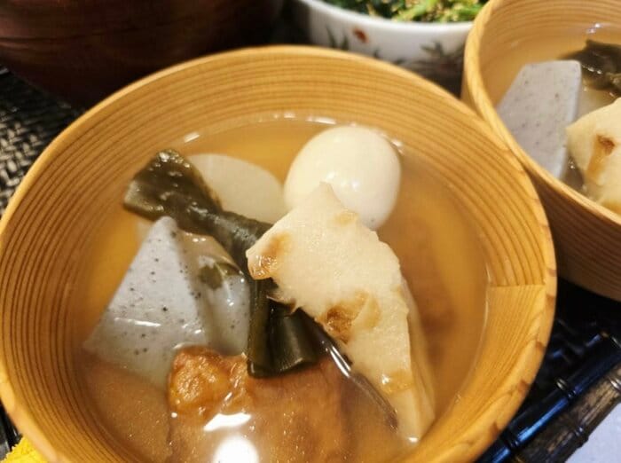 木の器には、出汁が染みた大根、こんにゃく、卵、焼きちくわ、昆布など定番のおでんネタが盛り付けられています。透明なだしが具材を優しく包み込んでおり、見ているだけで体があったまってきます。