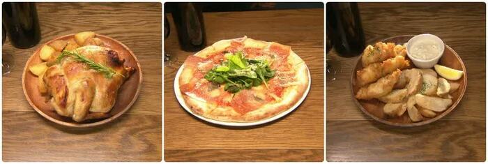 山田裕貴が来店したのは「HAGARE」。薩摩ハーブ鶏を1時間かけてじっくりと焼き上げた一番人気のロティサリーチキン(2480円)、イタリア産の生ハムを使用した、生ハムとベビーリーフのマルゲリータ(1580円)は、生ハムの塩気にチーズのコクが加わり絶妙なおいしさ。名物フィッシュ&チップス(1200円)は、粒マスタードを加えた特製タルタルソースで。気まぐれグラスワイン(赤/300円)で乾杯。