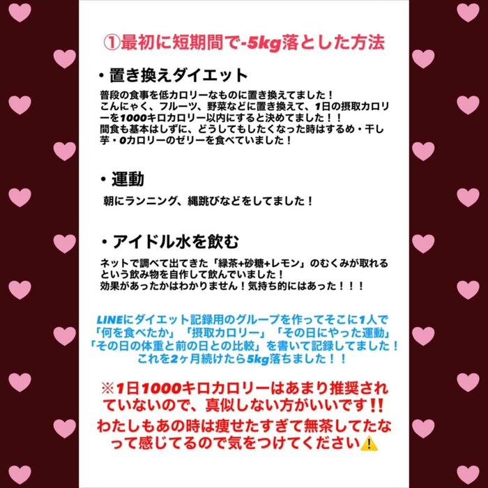 さらに、倉本さんは翌日の投稿で「【-10kgダイエット方法】①最初に短期間で-5kg落とした方法②その後徐々に-5kg落とした方法」とつづり、減量方法を画像で紹介。
