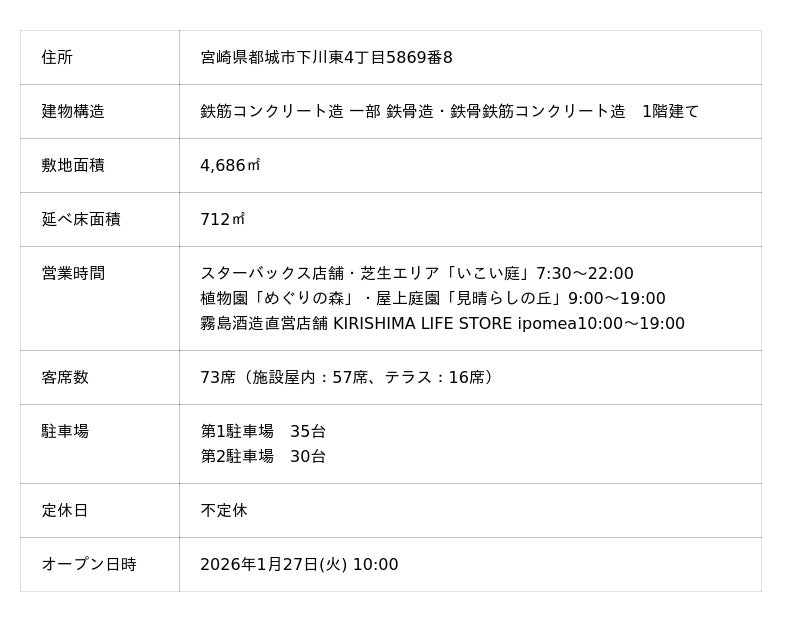 スターバックス コーヒー ジャパン 株式会社[本社所在地:東京都品川区、代表取締役最高経営責任者(CEO):森井久恵]と、霧島酒造株式会社[本社:宮崎県都城市、代表取締役社長:江夏邦威]は、都城の豊かな自然を楽しみ、人々が集い、憩う施設、「KIRISHIMA GREENSHIP icoia(キリシマ グリーンシップ イコイア)」を2026年1月27日(火)に開業いたします。