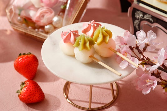スイーツは、いちごやベリーのフレッシュな味わいを楽しめるタルトやエクレア、桜の飾りをあしらった桃色のムースやオペラ、小さなフォルムが可愛らしい2色の団子など、お花見気分を高める華やかな7種類がスタンドを彩ります。