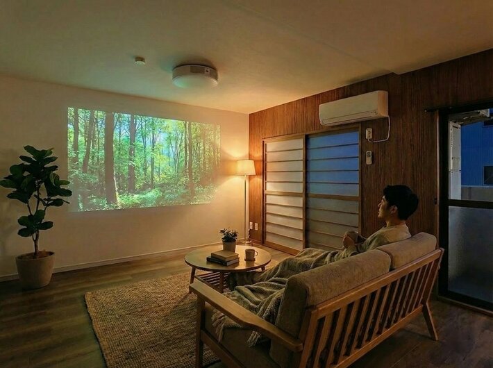 仕事帰り、コンビニの袋をテーブルに置いて、靴下のままソファに沈む。スマホでいつも通り動画アプリを開く--でも今日は、画面は見ない。天井の照明リモコンを押して、プロジェクターを起動。スマホをミラーリングすると、白い壁いっぱいにタイトル画面が広がった。部屋の明かりを少し落とすと、木目の壁が静かな影になって、スクリーンの光だけが際立つ。「どうせ観るなら、大画面で。」--その一手間が、“自分だけの劇場”に変える。