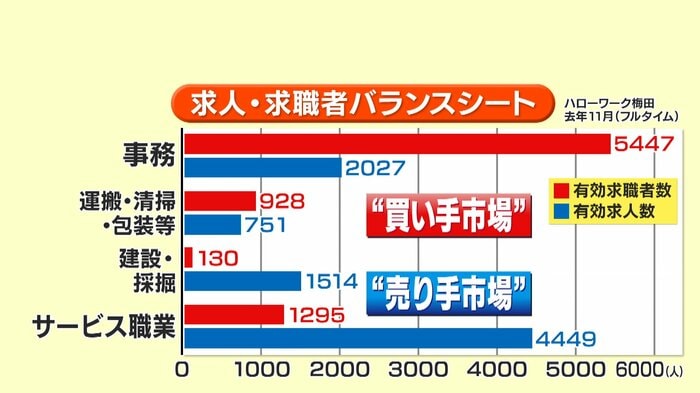 求人数と求職者数を比較したグラフを見ると、建設業やサービス業は求職者の数より求人数が多い“売り手市場”の一方で、事務職などは求職者の方が多い“買い手市場”に。