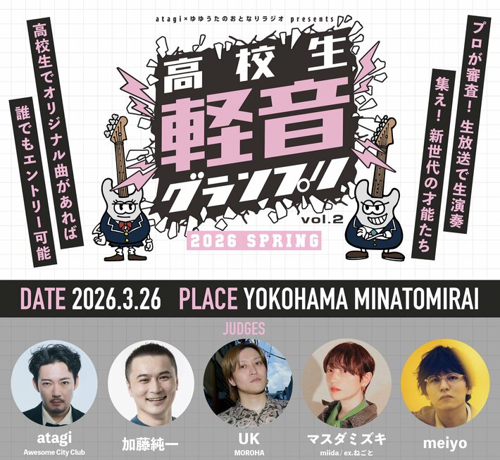 「高校生軽音グランプリ」とは、YouTubeの音楽番組「atagi×ゆゆうたのおとなりラジオ」が主催となる高校生バンドの全国大会。2026年3月26日に横浜みなとみらいで開催される決勝戦では、動画審査で選ばれた高校生バンドがオリジナル曲を生放送で生演奏。プロのミュージシャンらが審査し、高校生No1バンドを決定する。