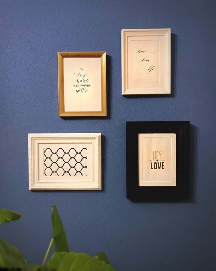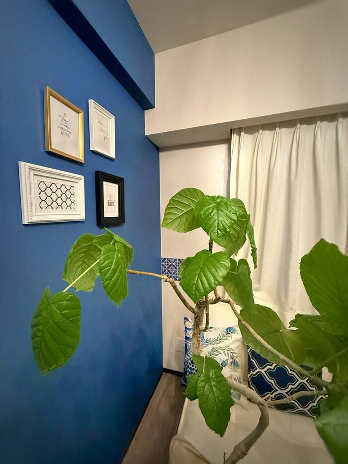 「好きな言葉や柄を額に入れて飾り、本を読んだり 、絵を描いたり 。自分の魂が喜ぶ時間を過ごす場所は、ブルーの心鎮静させる色の壁に」と、青色の壁にこだわりを持っている様子のアン ミカさん。