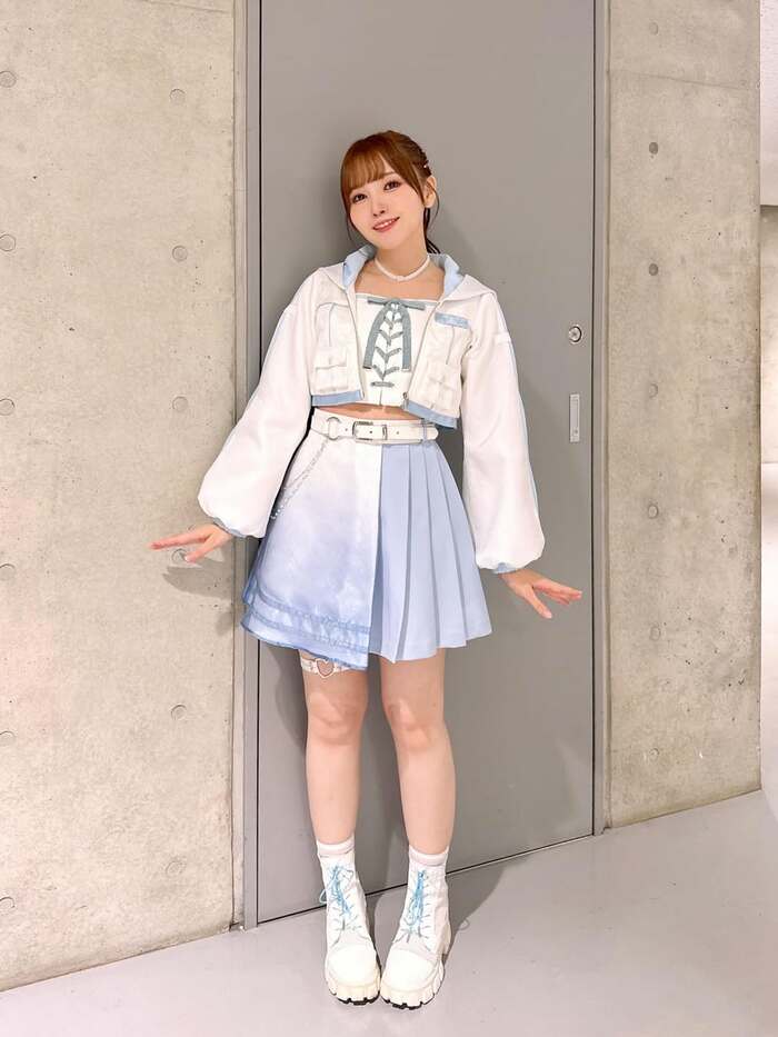 さらに、ロングヘアをポニーテールでまとめた、白と水色のグラデーションカラーがかわいらしい衣装姿も公開。