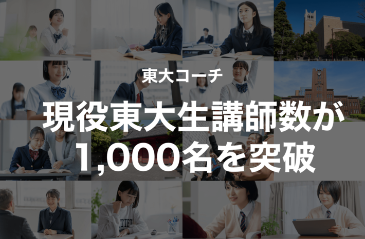 オンライン家庭教師サービス「東大コーチ」を運営するスタディチェーン株式会社(所在地:東京都渋谷区)は、東大コーチに在籍する現役東京大学生・大学院生講師数が1,000名を突破したことをお知らせします。
