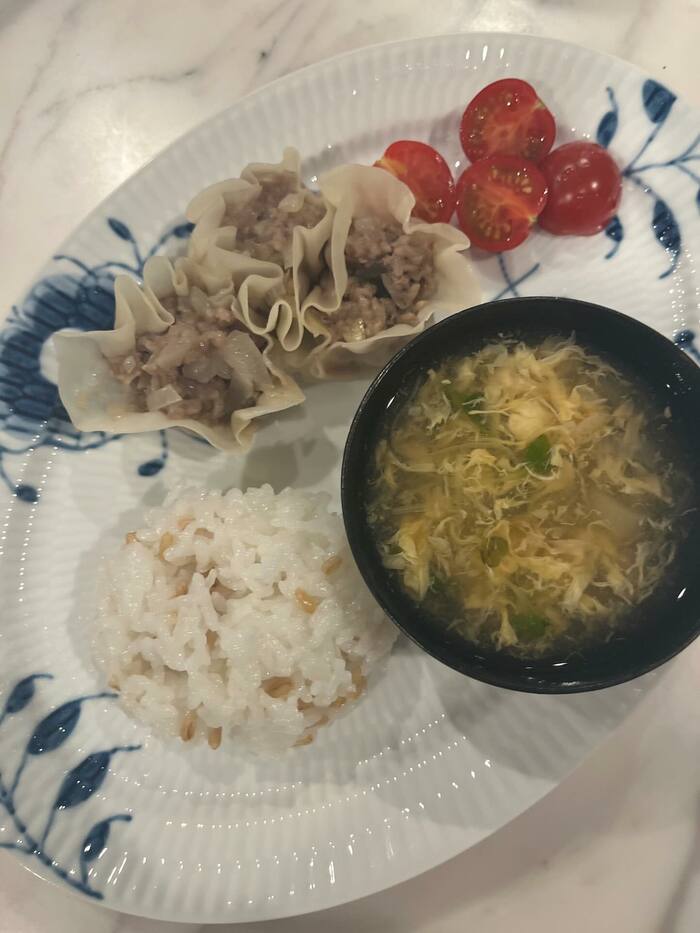 写真を見ると、花柄が描かれた白のお皿にご飯やシューマイ、ミニトマト、おわんに入ったスープが用意されています。