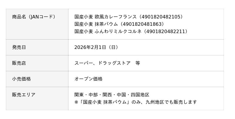 敷島製パン株式会社(Pasco)は、2026年2月1日(日)から「国産小麦」シリーズの新商品として「国産小麦 欧風カレーフランス」「国産小麦 抹茶バウム」を発売します。また、「国産小麦 ミルクコルネ」を「国産小麦 ふんわりミルクコルネ」として、同日リニューアル発売します。