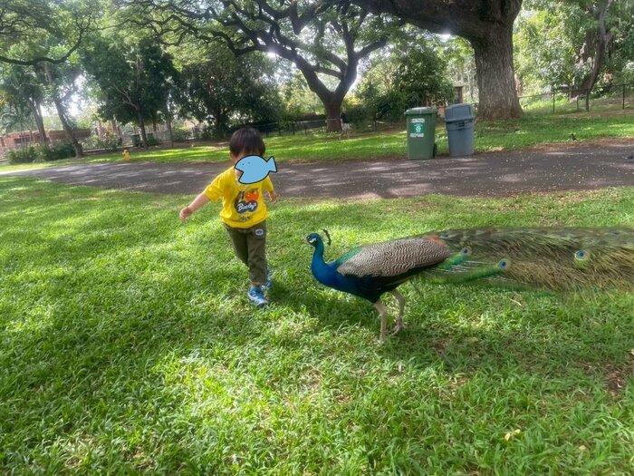 公園でクジャクに興味津々な姿など、ほのぼのとした旅の一コマも紹介されています。