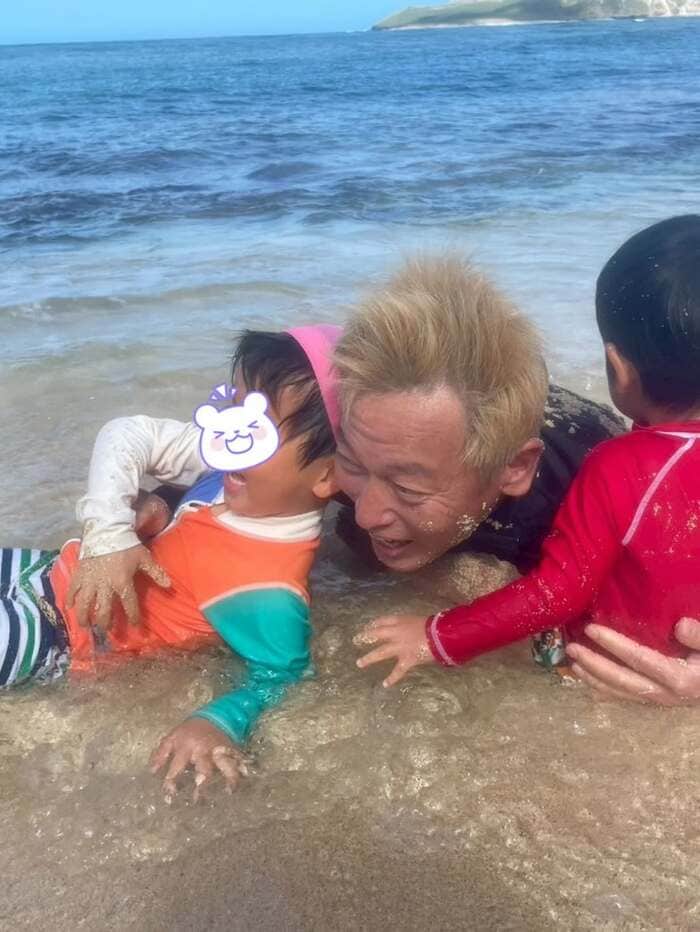 そして、次第に慣れてきた様子で、じゅんいちさんに抱っこされながら浅瀬で波を楽しむショットも公開。子どもたちと一緒にはしゃぐじゅんいちさんの笑顔から、旅の楽しさが存分に伝わってきます。