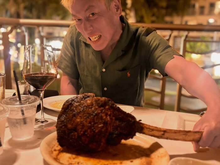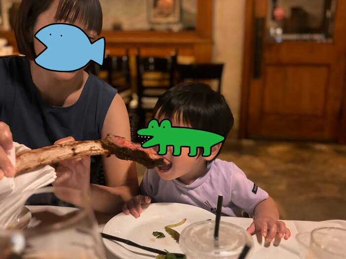 子どもの顔より大きな肉に、思い切りガブッとかぶりつくショットや…