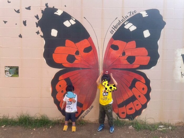 動物園を訪れたのか、大きなチョウの壁画の前でポーズを決める子どもたちに…