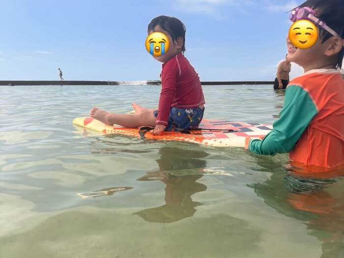 笑顔はじける長男とは対照的に、次男は海には入らず、ボディーボードの上に乗せられて海面にプカプカと浮かんでいて、兄弟それぞれの反応がとても微笑ましい一枚です。