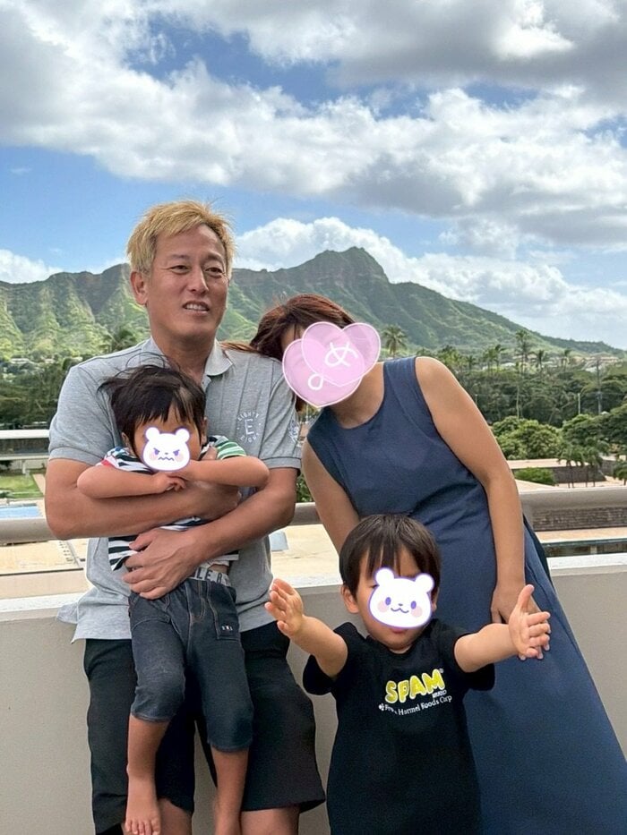 投稿された写真には、黒のノースリーブ姿の妻と、おそろいの黄色いTシャツに青いズボンをはいた4歳と2歳の息子2人が、楽しそうにポーズを決める姿が写されています。じゅんいちさん以外の3人は、左耳にオレンジやピンクのプルメリアの花を身につけ、ハワイを満喫している様子が伝わってきます。
