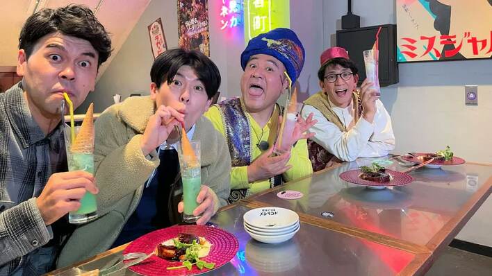 アンタッチャブル扮する、ザキヤ魔人(山崎弘也さん)とシバタン(柴田英嗣さん)が繰り広げる、ハイカロリーグルメバラエティ『腹ペコ魔人のグルメな魔法 脂過多ブラ』(1月25日放送/東海テレビ)。