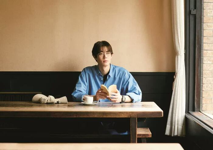 「僕の普段の旅の姿を見てほしい」と語り、お気に入りのカットを聞かれると、老舗の喫茶店でモーニングコーヒーを飲みながら読書をしているカットを紹介。