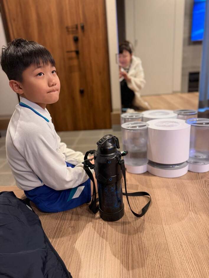 そこには、温かみのあるウッド調の広々とした自宅玄関に、腰を下ろした次男の姿が。