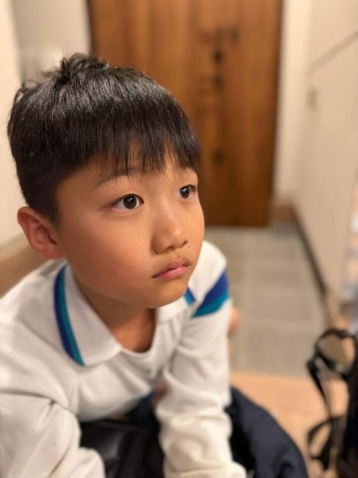 今回の投稿では「おかえり はっちゃん」と、つづり9歳次男の姿を公開。
