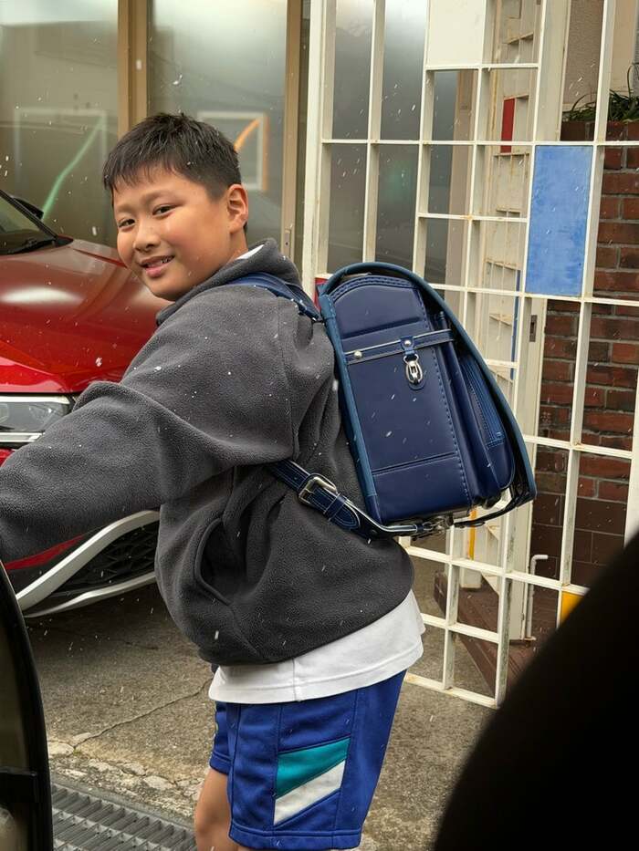 外でランドセルを背負いながら、フリースに体操服の短パンで足を出した姿は、元気いっぱいに感じられます!