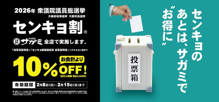この度、株式会社サガミホールディングス(本社:名古屋市守山区八剣2丁目118番地 代表取締役社長 大西 尚真)は、2026年2月8日に予定されている第51回衆議院議員総選挙にあわせ、「投票済証明書」または「センキョ割模擬投票 投票証明書」をご提示いただくことで特典が受けられる「センキョ割」キャンペーンを実施いたします。