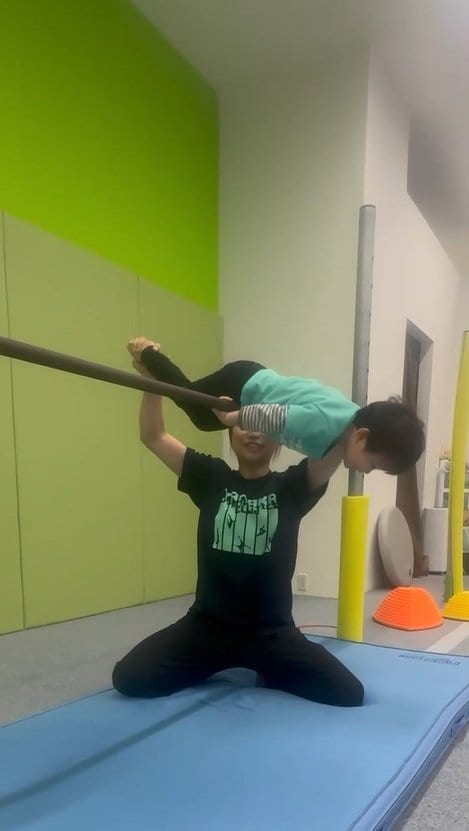 そして、先生の補助の元、腕を曲げて、おへそをグッと鉄棒に引き寄せた長男。足はピーンと天井に伸びていて、かっこいいです!