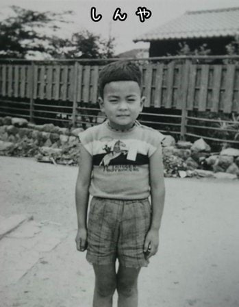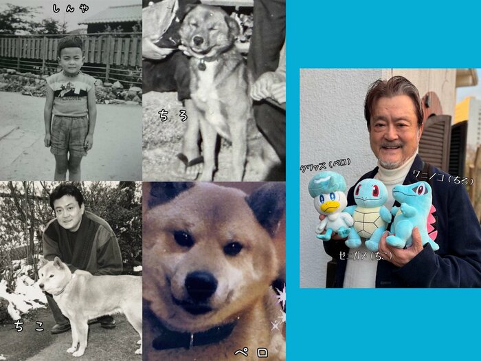 さらに、ワンちゃんに混じって、“しんや”とテキストされた幼少期の白黒ショットも添えられています。