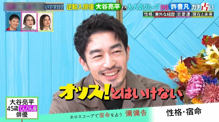 そんな大谷さんについて、彌彌告さんが「一見、近寄りがたい」と占うと、大谷さんは「見た目でしょそれ!こんな濃い顔してたら…『オッス!』とは(気軽に)いけない」と笑いました。