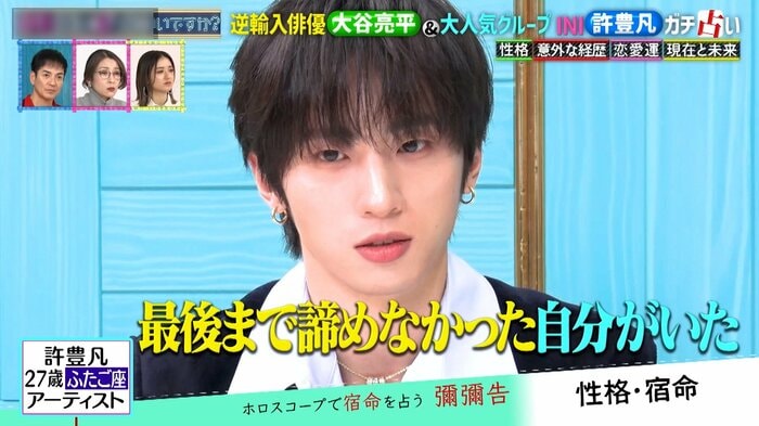 「最後まで諦めない」という鑑定にも納得の様子です。許さんは、サバイバルオーディション番組で101人の中から最終メンバーの11人に残り、「INI」としてデビュー。「あのときは最後まで諦めなかった自分がいました」と、当時を振り返りました。
