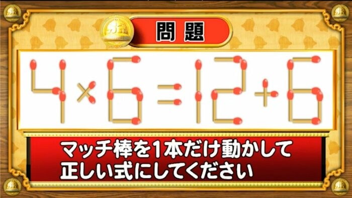 「4×6=12+6」。この式のマッチ棒を1本だけ動かして正しい式にしてください。