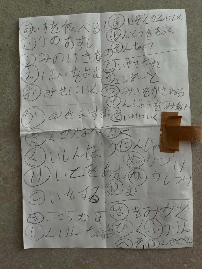 別のショットを見ると、大きな紙に『あ』から『ほ』までどんな絵なのか端的にメモされています。『こいをする』や『へそ』など、どう描かれたのか全部見たくなってしまいますね。
