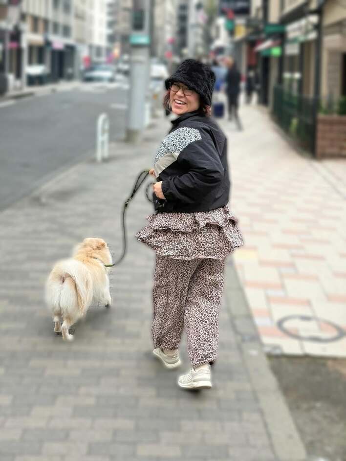 このコーデについて、バービーさんは「無意識コーデが全身ヒョウ柄だった時」とつづっていて、愛犬と一緒にお散歩に行った際の姿も公開。