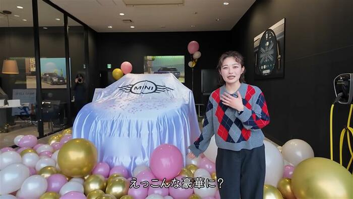 ベールに包まれた車の周りには、ピンクや金色などたくさんの風船が飾られていて、井上さんは「えっこんな豪華に?」と、まさかの盛大なお祝いに驚きを隠せません。