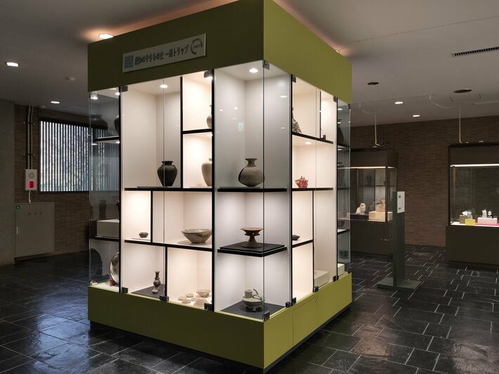 1.愛知のやきもの史一周トリップロビー中央の柱を囲む高さ約3mの4面ガラスケースが、展示空間の入口としてお客様を迎え、新しい展示のワクワク感を演出します。ケースの中には愛知のやきものが展示されており、ぐるりと一周することで、愛知で作られてきた紀元前から現代までのやきものについて知ることができます。