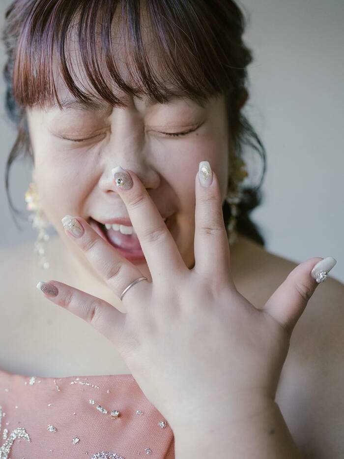 薬指に結婚指輪をはめた手ではじける笑顔の口元を隠したりと、どれも素敵な1枚です。