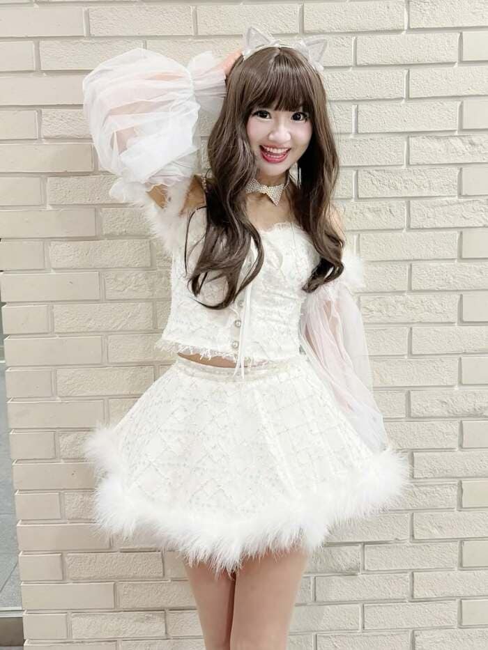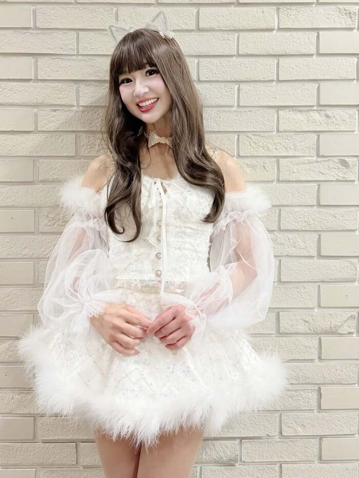 そこには、ナチュラルなブラウンカラーのゆるふわなロングヘアをした♥さゆりさんの姿が。さゆりさんは、腕の部分がチュールになったオフショルのトップスに、ふわふわのファーがついたミニスカートを合わせた全身ホワイトコーデをしています。頭には、トレードマークの大きな髪飾りではなく猫耳のカチューシャを付けていて、カメラに向かって笑顔を見せています。