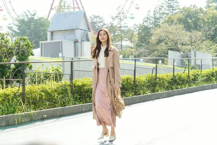 一ツ山:トレンドのトレンチでフェミニンモードなコーディネートに仕上げています。全体を淡めのカラーで統一感を持たせ、トップスインして上半身をすっきりと、ピンクのロングスカートでIラインを強調してバランスアップしています。ショルダーコンシャスな白のニットは女性らしさを意識しています。