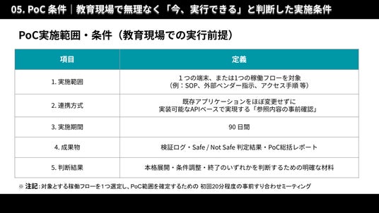 【 PoC実施条件の全体像(教育現場での実行を前提とした設計) 】1業務フロー・1端末から開始でき、既存システムや運用を大きく変更することなく、90日間で実運用に基づく検証結果を取得できるPoC設計。