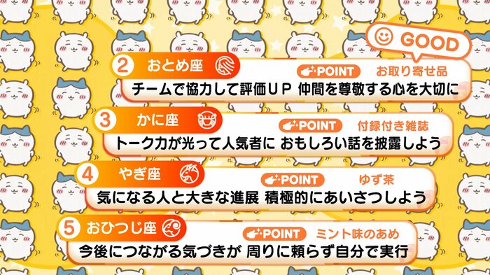 『めざましテレビ』で放送中の「ちいかわ占い」 テレビ放送がない日はお休みで、月~土:朝7時以降に更新予定です。