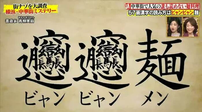 中華街に向かった副担任のノブと学級委員長の風間俊介がまず解き明かすことになったのは、中華街で見かける難しい漢字の読み方。1文字57画、麺まで入れると、合計130画もある上の写真の文字(パソコンでは書き出せない)、果たして何と読むのだろうか?