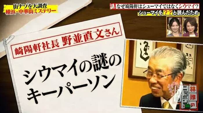 そこでノブが「シウマイの中に“ウマイ”が隠されているからではないか」とひらめく。しかし、創業111年を数える老舗店の社長・野並直文氏によると、それは“後付け”の理由だという。